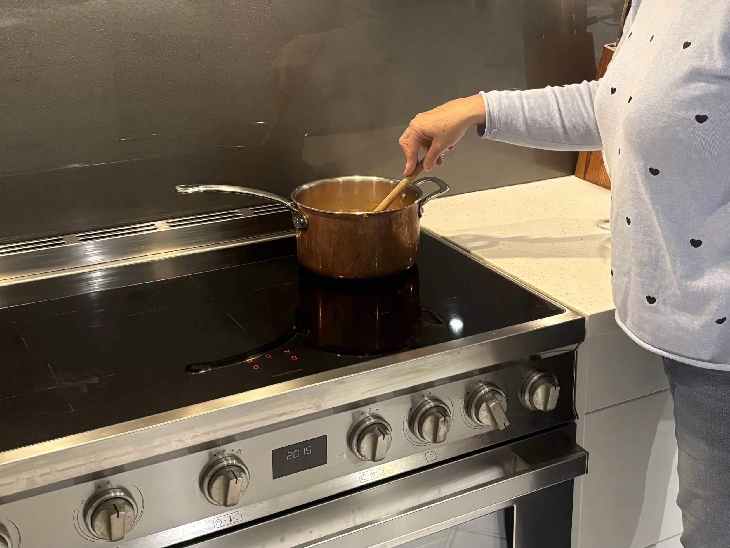 We also have occasions when all five burners on the wide cook-top are in play. A sleek, shiny, easy-to-clean induction cook-top - again mainly for the fast heat - suited our needs. It gets used several times a day - from boiling the kettle for a cuppa to cooking our meals.
